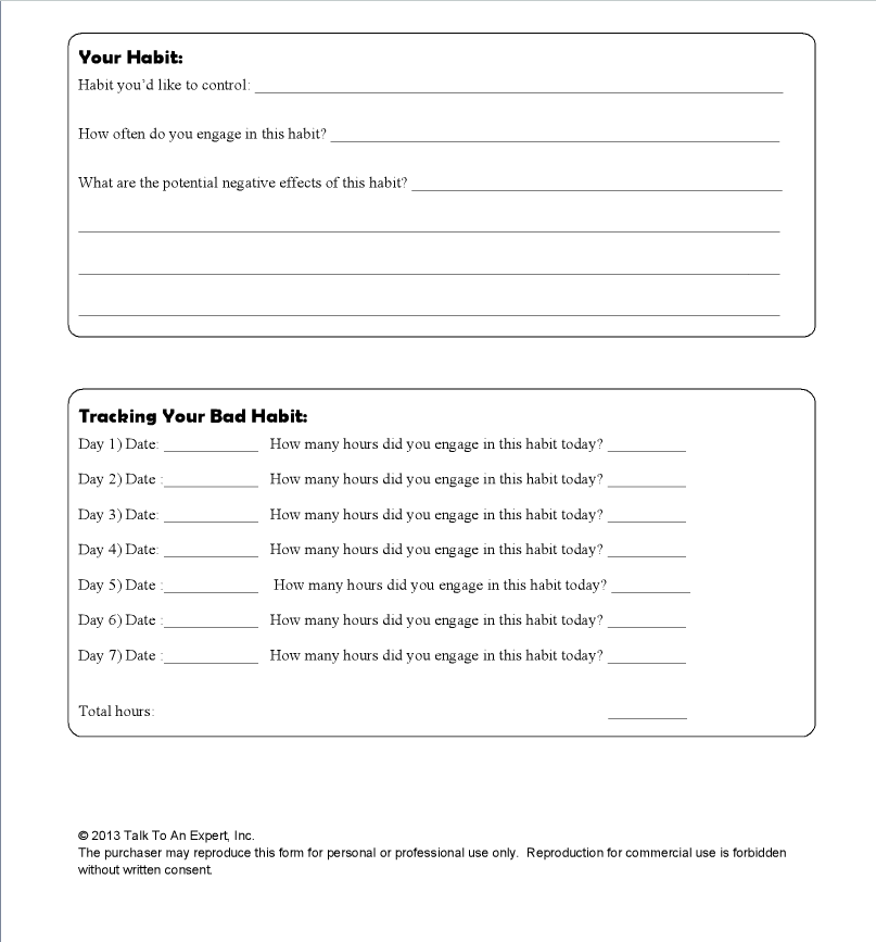 Understanding Your Habits — This worksheet can be used to help people identify their problematic habits and see the affect these habits have on their lives. (View & Print)